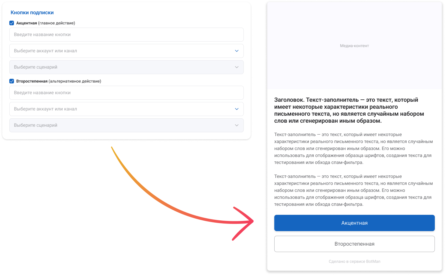 Здесь вы выбираете, в каком боте или канале будет происходить подписка.Список формируется автоматически из ваших подключённых каналов: