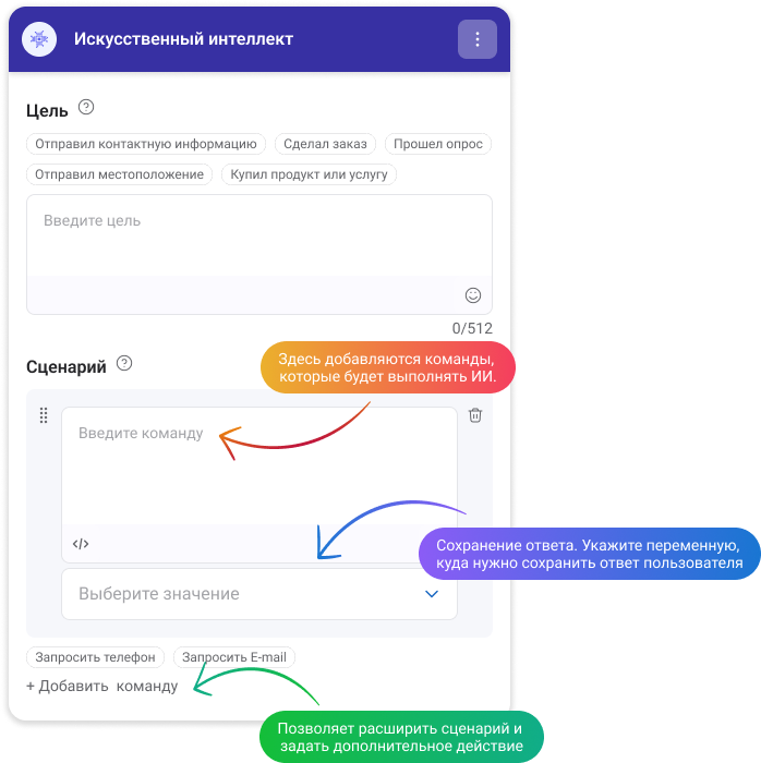 Сценарий — это список команд, которые ИИ выполняет во время общения с пользователем.Он помогает ИИ понимать, что нужно сделать, в какой последовательности, и как достичь цели, которую вы задали.
