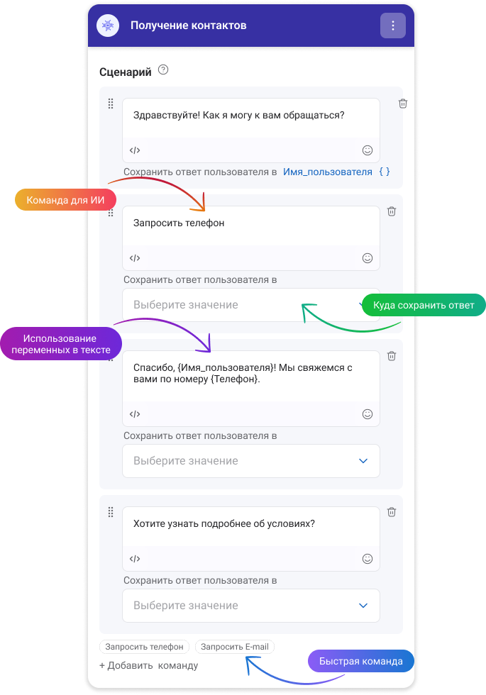 Каждая команда — это шаг в диалоге: вопрос, предложение, действие. Правильно составленный сценарий: