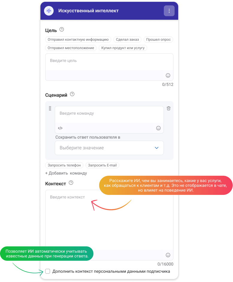 ✅ Галочка «Дополнить контекст персональными данными подписчика» — добавит к вашему описанию имя, email и другие данные, которые уже есть в BotMan.