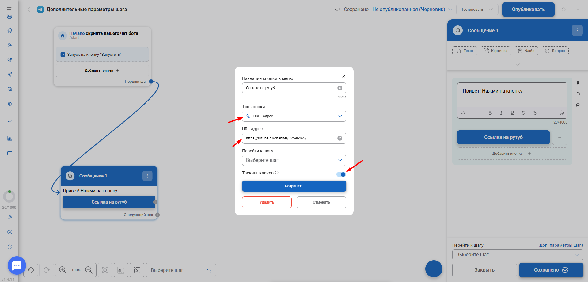 ✨ Обязательно шаг нужно оформить текстом/картинкой/видео, иначе сообщение с кнопками может не отправляться..