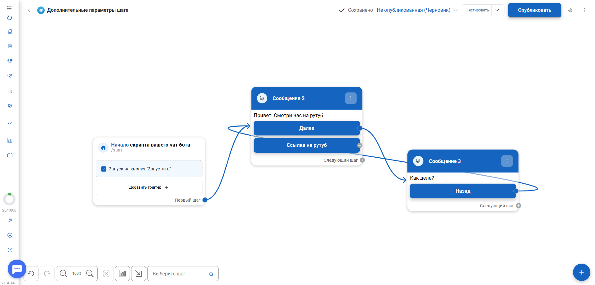 Если выбрать переход к шагу «Сообщение 3», то при нажатии пользователь попадёт на этот шаг.