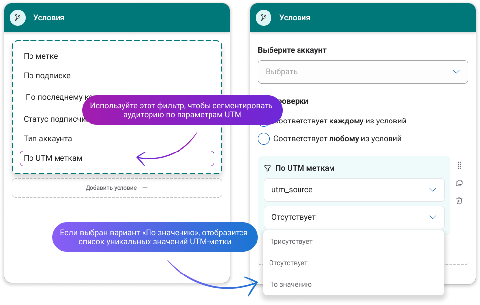 💡 Пример: Вы хотите отправить сообщение пользователям, пришедшим из рекламы в Instagram. Выберите utm_source = Ввконтакте.