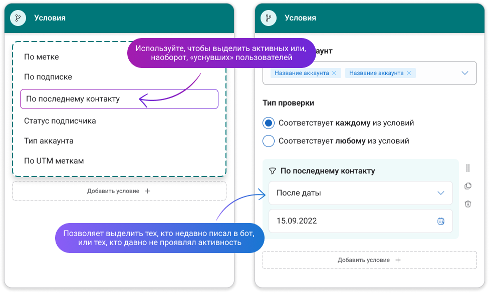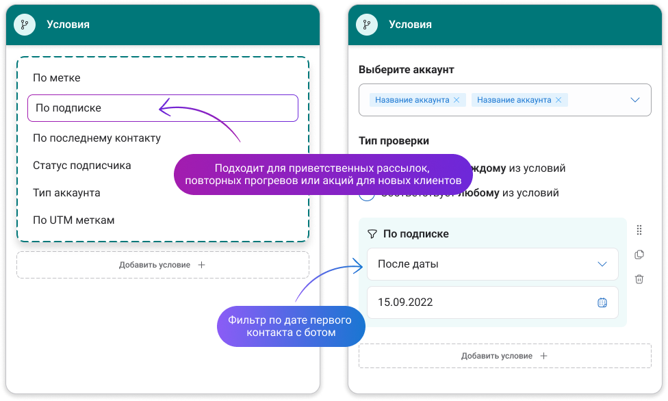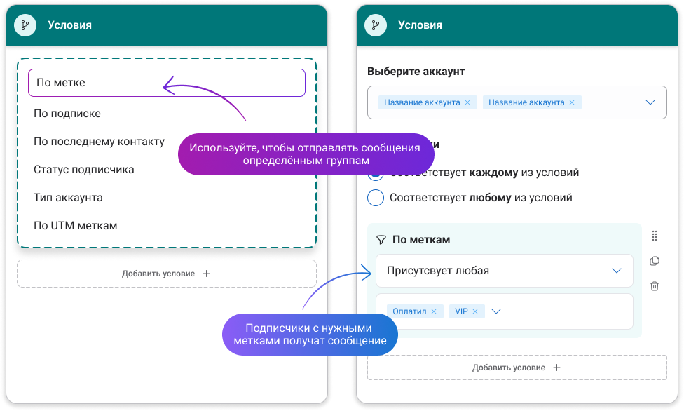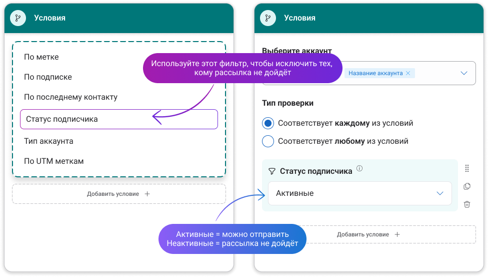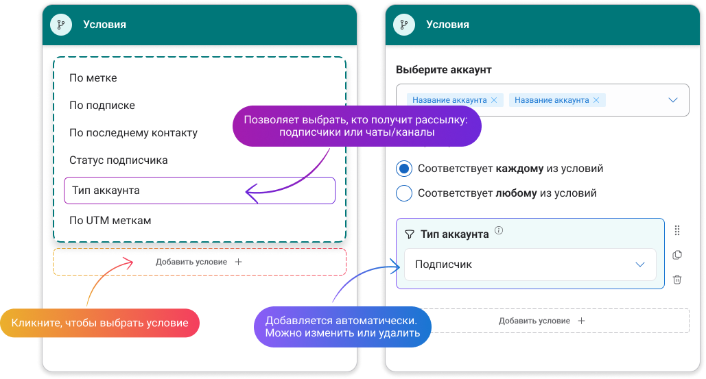 💡 Подписчик попадёт в рассылку один раз, даже если соответствует нескольким условиям.