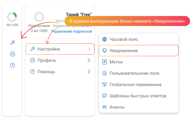 Перейдите в меню «Настройки» ⟶ «Уведомления» (иконка 🔔):