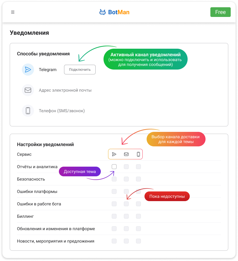 1. Каналы уведомлений — где вы подключаете/отключаете способы доставки.