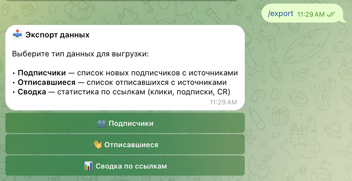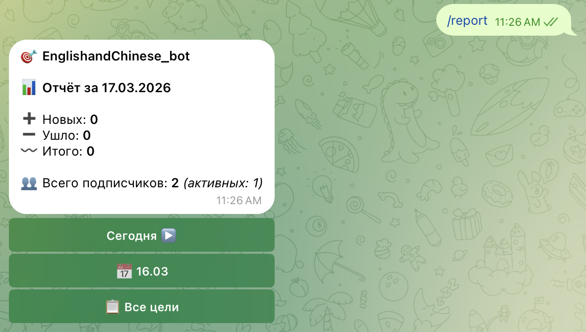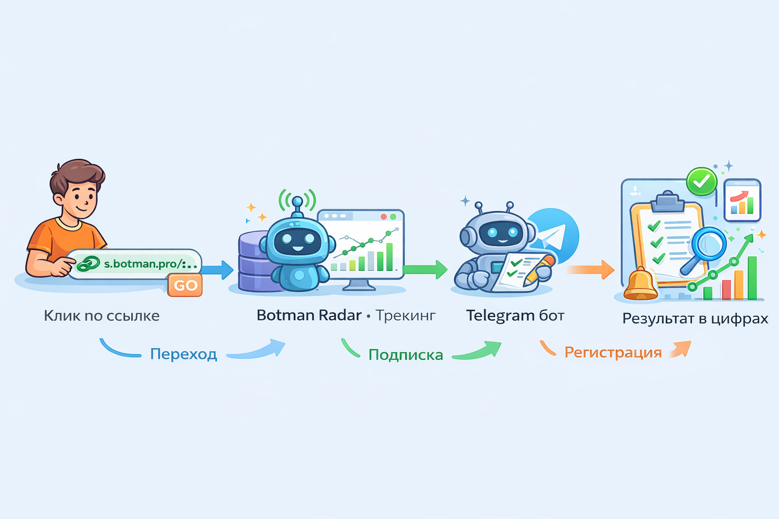 Пользователь нажал ссылку → Radar запомнил источник → пользователь открыл бота / подписался → вы видите результат в статистике