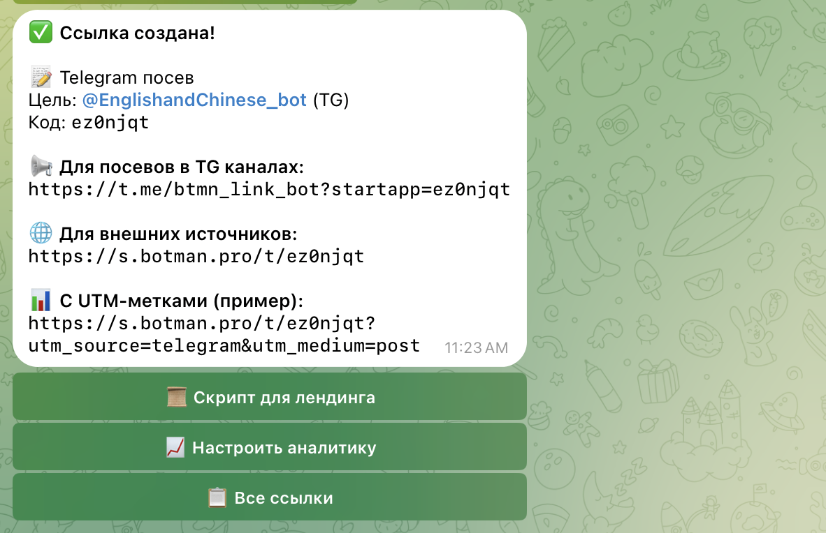 Пример готовой ссылки:https://s.botman.pro/t/XXXX?utm_source=telegram&utm_medium=seed&utm_campaign=webinar&utm_content=channel1