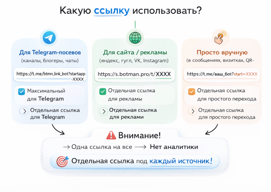 🔹 Используйте эту ссылку, когда необходим максимально точный трекинг и сбор данных о переходах внутри Telegram.