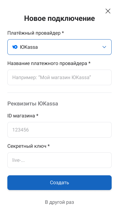 Давайте подключениям понятные названия. Например: «Основной магазин ЮKassa» или «Т-Банк для курсов». Потом это сильно помогает не запутаться.