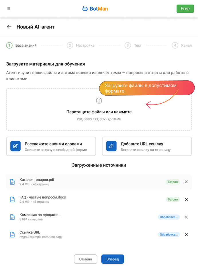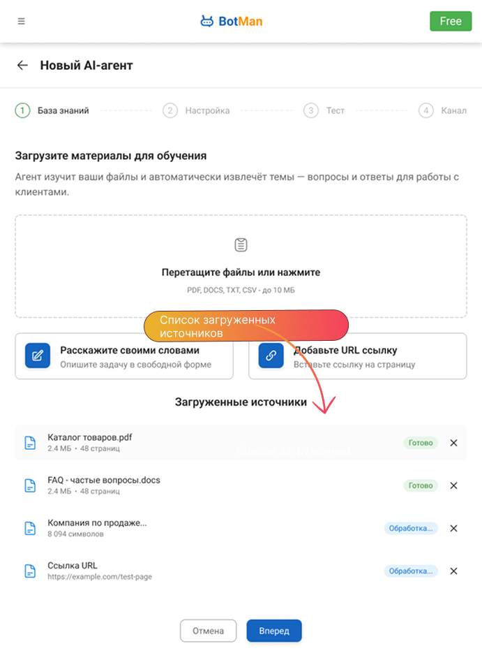 После загрузки материалы обрабатываются системой. Пока источник не готов, агент может ещё не использовать его в ответах. Поэтому после добавления новых файлов лучше сначала дождаться статуса готовности, а затем ещё раз проверить ответы в тестовом чате.