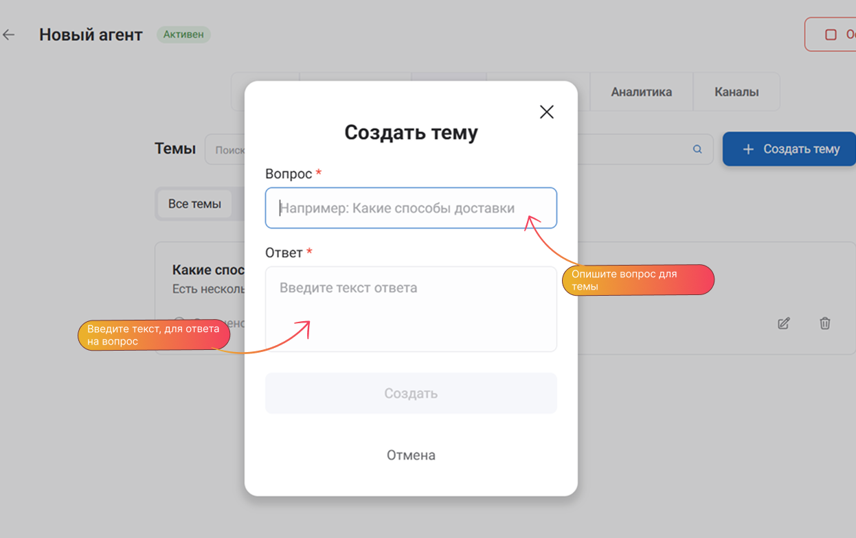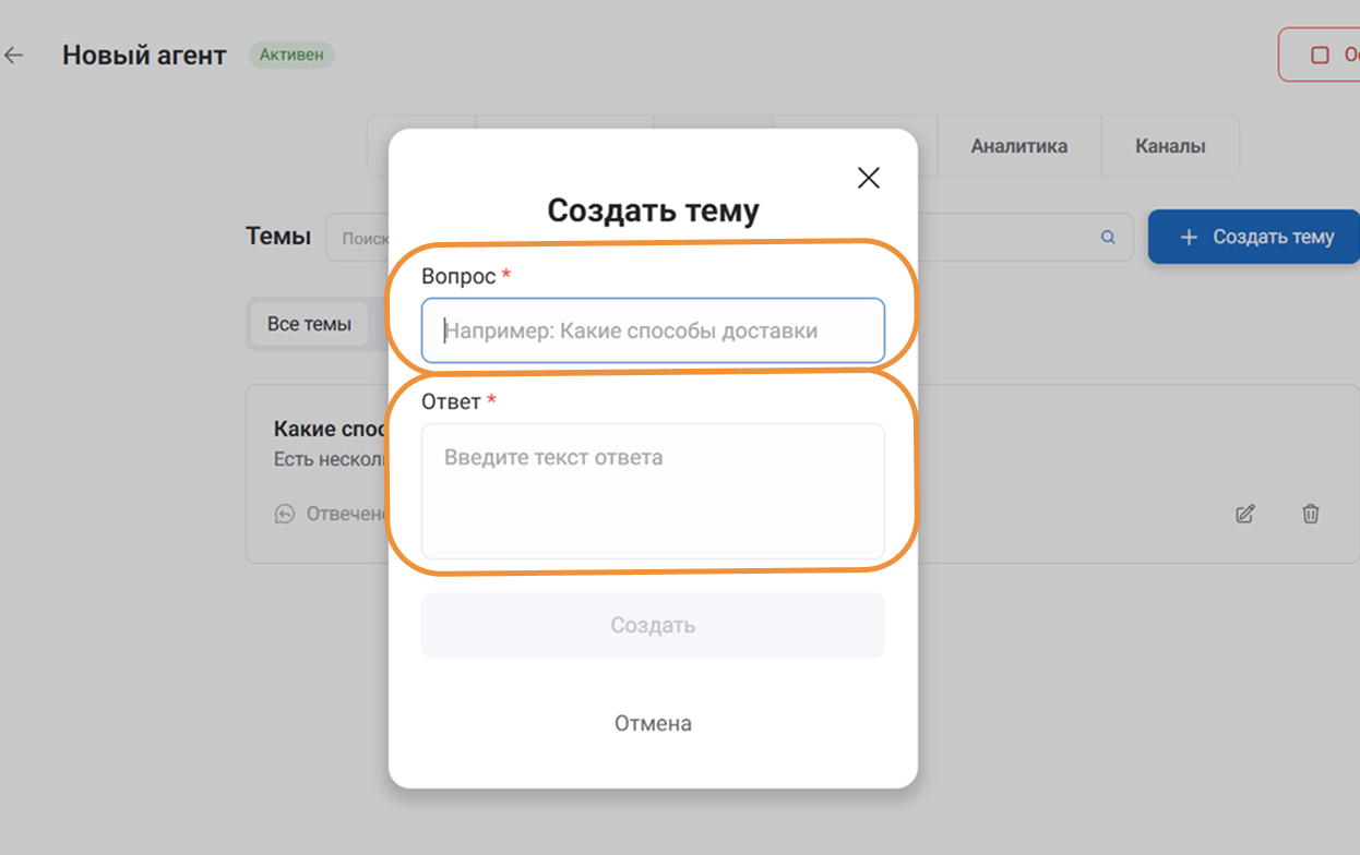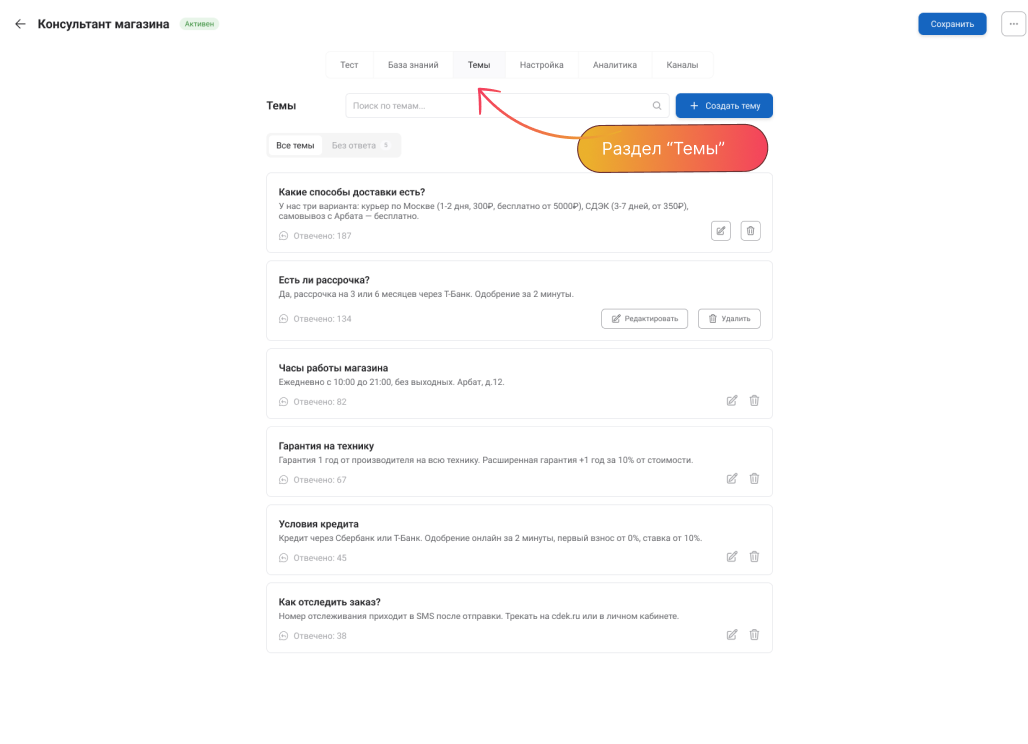 Темы - это заранее подготовленные пары «вопрос - ответ», которые помогают AI-агенту быстро и стабильно отвечать на типовые обращения пользователей.