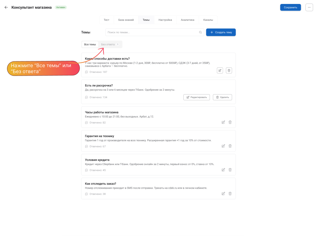 Перейдите во вкладку «Без ответа» → Найдите вопрос, на который агент не смог ответить → «Создать тему» у нужного вопроса: