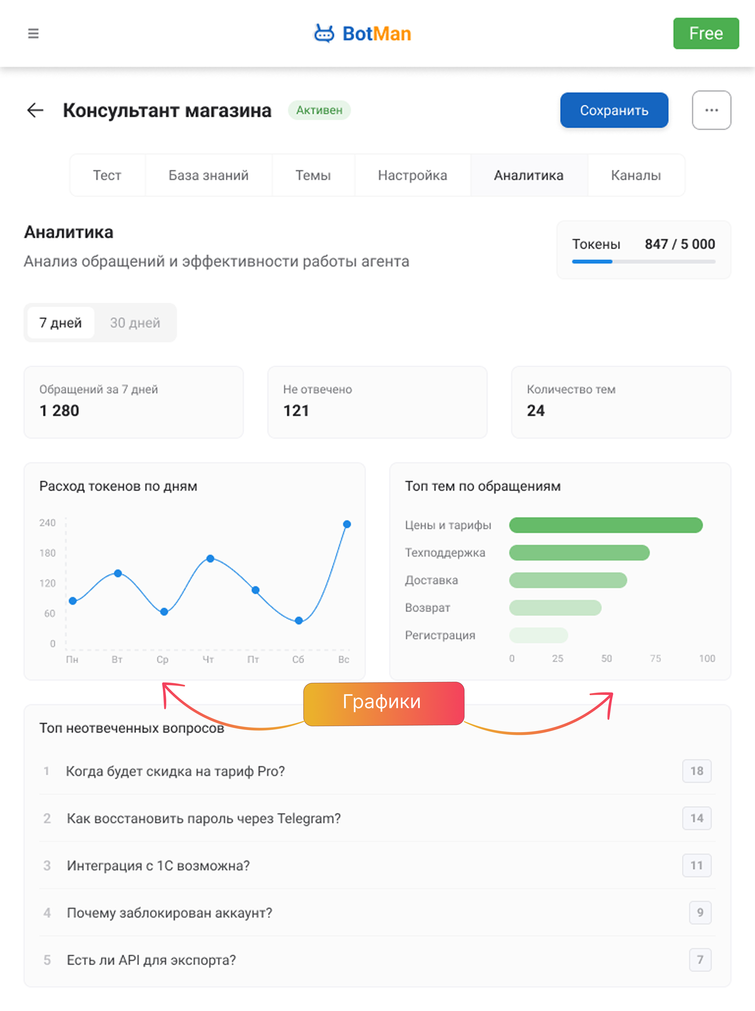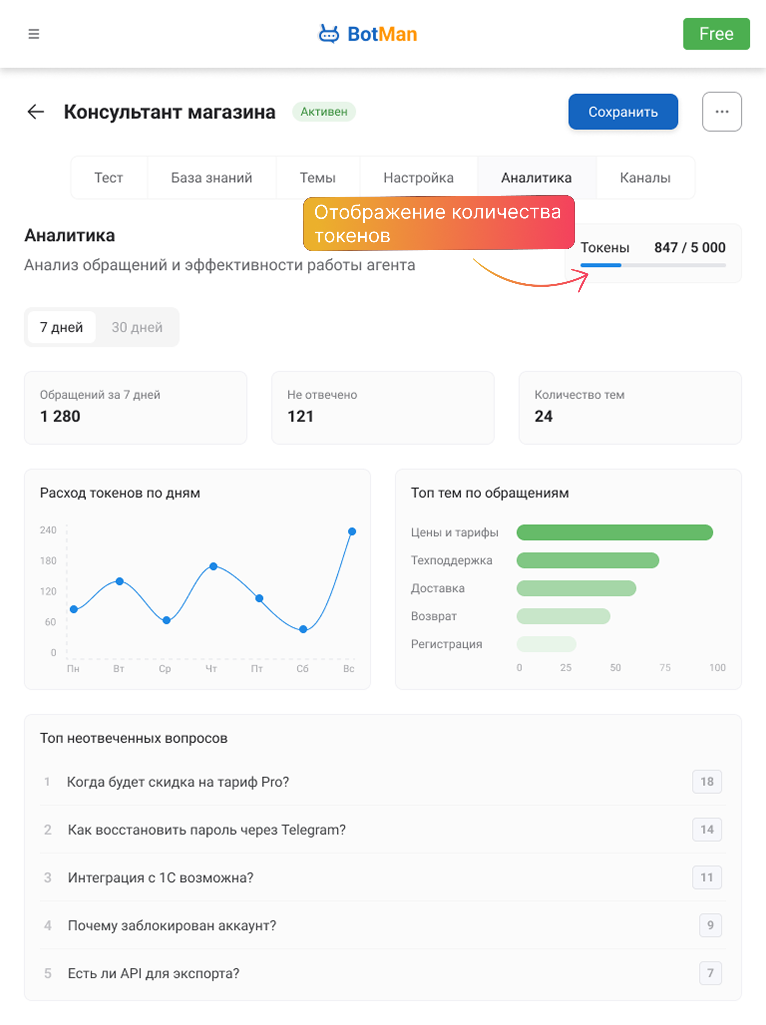 В аналитике показывается отдельная полоска с токенами за выбранный период. Один запрос считается как 1 токен в рамках этой внутренней метрики аналитики. Также мини-счётчик токенов виден в шапке агента.