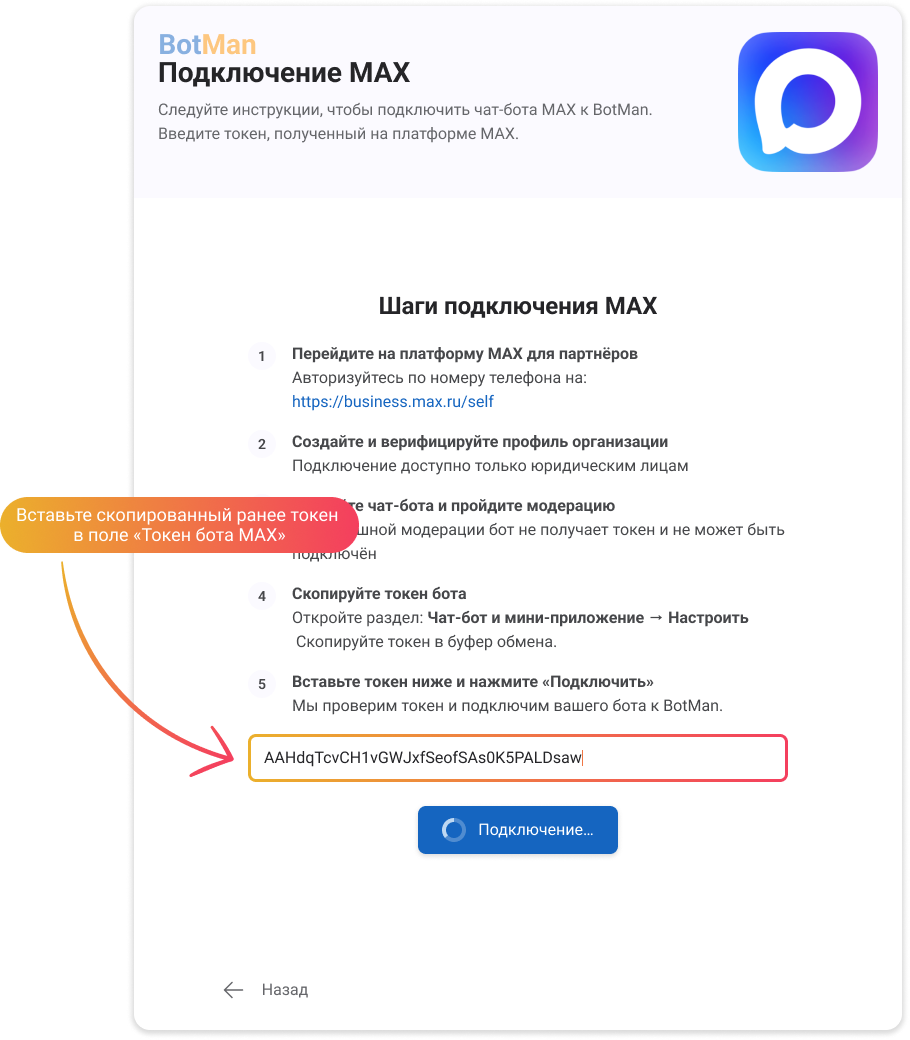 Вставьте в поле токен, который вы скопировали на стороне MAX.
